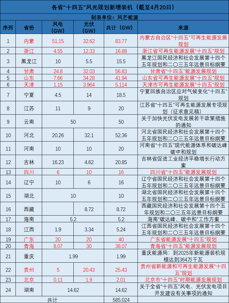 風(fēng)芒能源根據(jù)公開信息不完全整理,截至目前,已有24個(gè)省(市)“十四五”相關(guān)規(guī)劃出爐。這些省(市)規(guī)劃在“十四五”期間,新增風(fēng)光裝機(jī)約585GW。