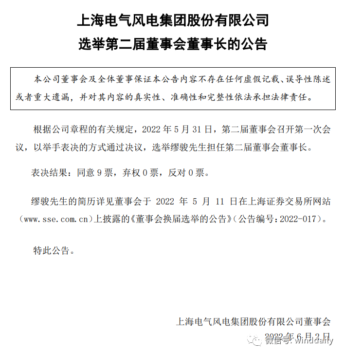 WindDaily獲悉,電氣風(fēng)電近日召開第二屆董事會第一次會議。會上一致通過:選舉繆駿為電氣風(fēng)電新任董事長,金孝龍不再兼任;聘任王勇、王明軍、吳改、鄭剛?cè)坞姎怙L(fēng)電副總裁,王勇暫代行總裁職責;聘黃鋒鋒女士任電氣風(fēng)電財務(wù)總監(jiān),任期為三年。全球最大的海上風(fēng)電整機商電氣風(fēng)電完成換帥。具體公告如下: