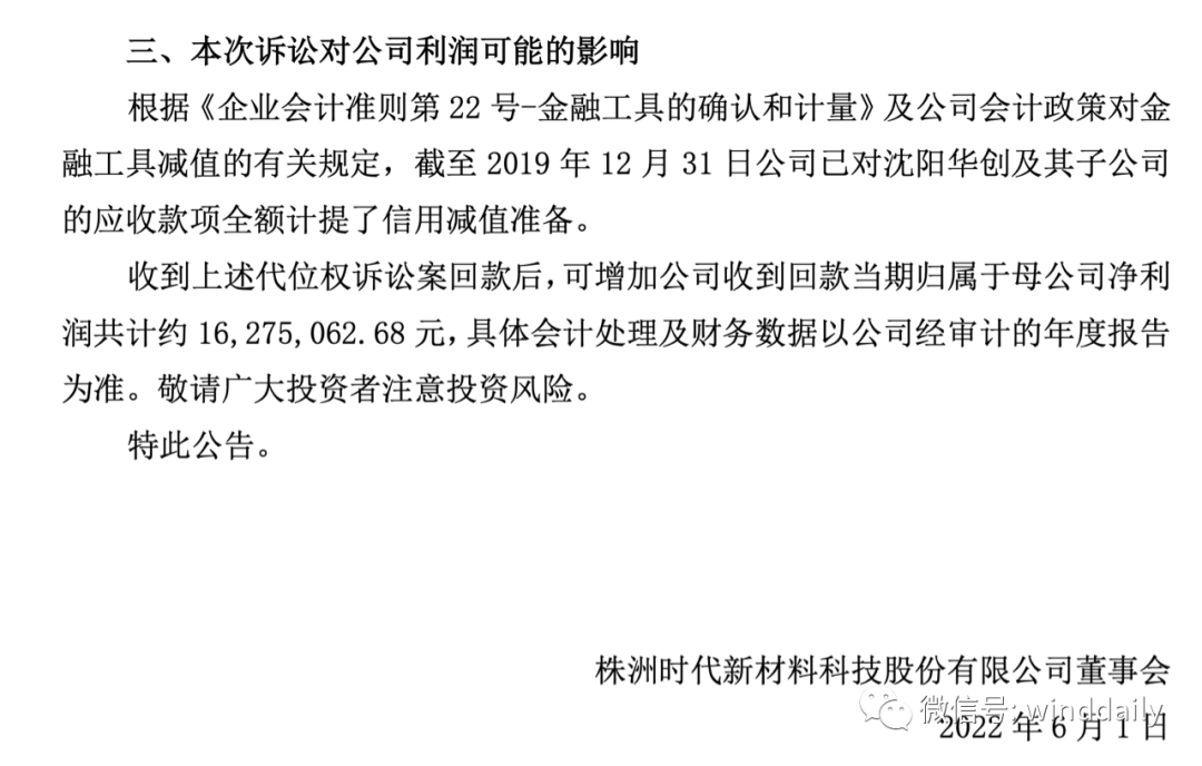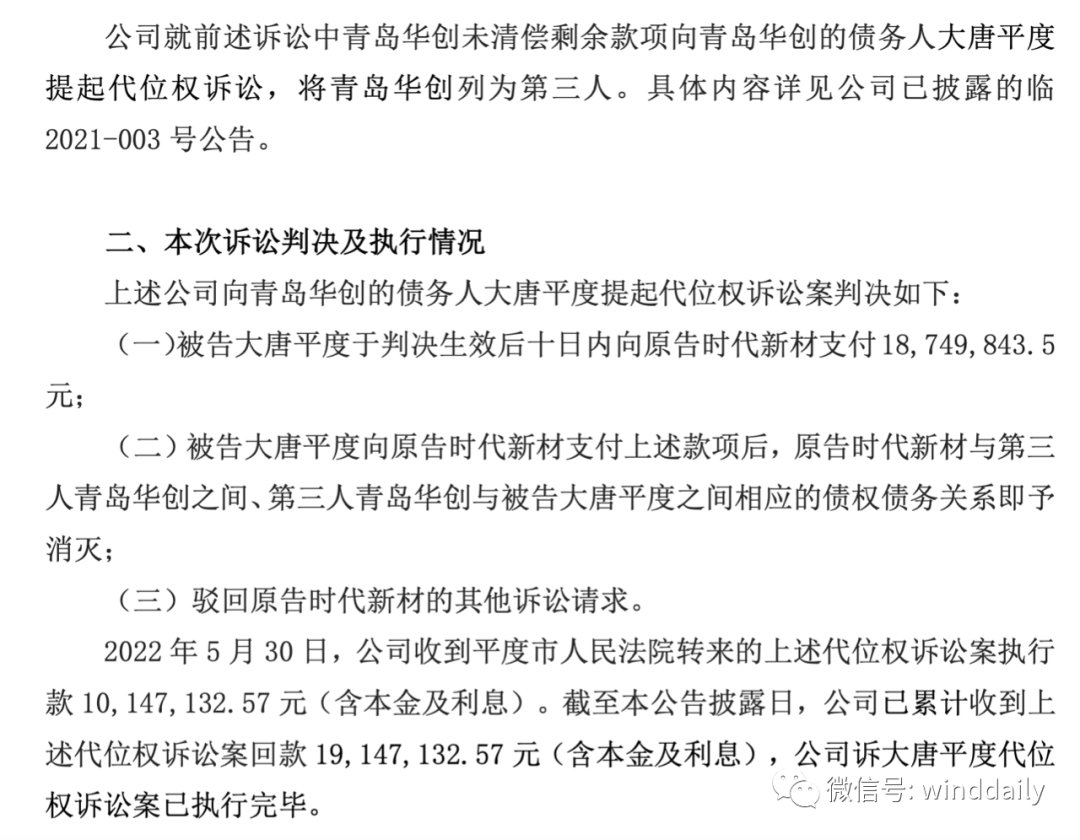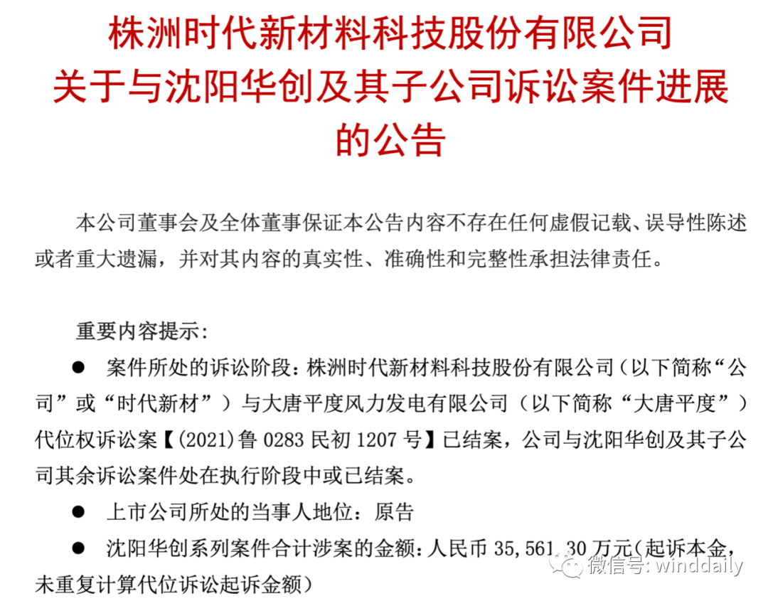 WindDaily獲悉,時代新材因與沈陽華創風能有限公司及其下屬三家子公司青島華創、寧夏華創、通遼華創 風電葉片及彈性支撐產品合同糾紛及票據糾紛而訴至公堂,涉案金額總計 35,561.30 萬元。法院判決:被告大唐平度于判決生效后十日內向原告時代新材支付 18,749,843.5 元;截至目前,時代新材已累計收到 公司與大唐平度代位權訴訟案回款 19,147,132.57 元,結案。公告原文如下: