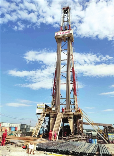 近日,記者從市區(qū)出發(fā)向東沿著津?qū)幐咚伲贿^半個小時車程,來到寧河區(qū)北淮淀示范鎮(zhèn)建設(shè)現(xiàn)場。遠(yuǎn)遠(yuǎn)看到示范鎮(zhèn)一期安置房北側(cè)的空地上,一座50多米高的鉆井架聳立在藍(lán)天下,懸吊在井架上的鉆桿正旋轉(zhuǎn)著向地下挺進(jìn)。
