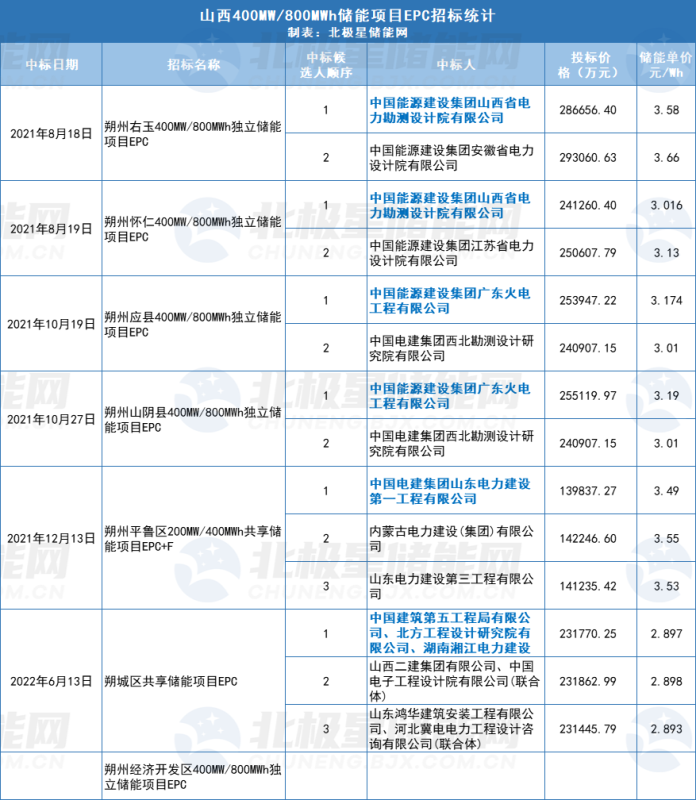 從前幾個大規模儲能項目開標情況來看,中國能建、中國電建下屬幾個單位包攬了這些項目,中標均價約3.21元/Wh。此次新招標的朔州經開區儲能項目不知又將花落誰家?