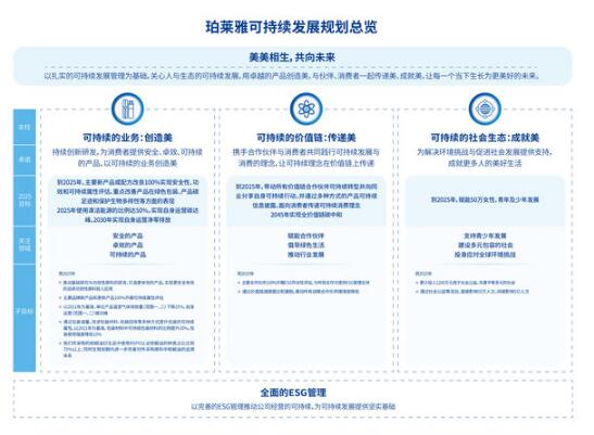 此前,珀萊雅已經連續兩年發布《可持續發展報告》和《環境、社會與公司治理報告》。2022年,結合自身實際情況,帶著對社會可持續發展的承諾,珀萊雅發布了"可持續發展戰略規劃(2022-2025)"—"美美相生,共向未來",該發展規劃兼顧自身發展與社會貢獻,提出了"可持續的業務、可持續的價值鏈、可持續的社會生態"三大支柱,及對應的可持續發展目標,期待在自身可持續發展轉型的帶動下,與行業同道、合作伙伴以及消費者并肩同行,既能不斷滿足消費者求"美"的需求,又共同創造可持續發展的行業生態,實現可持續發展的長遠目標。