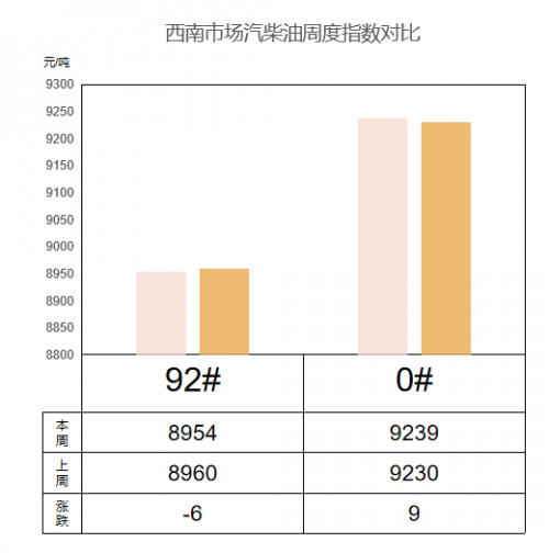 華中(湖南、湖北、江西、安徽) 成品油價(jià)格汽跌柴穩(wěn)。本周92#汽油市場(chǎng)價(jià)格為8714元/噸,較上周下跌32元/噸,跌幅0.37%;0#柴油市場(chǎng)價(jià)格為9025元/噸,較上周上漲167元/噸,漲幅1.89%。目前來看,油價(jià)底部支撐得到持續(xù)加固,短期內(nèi)大跌風(fēng)險(xiǎn)明顯減弱,或仍將在相對(duì)高位區(qū)間運(yùn)行。