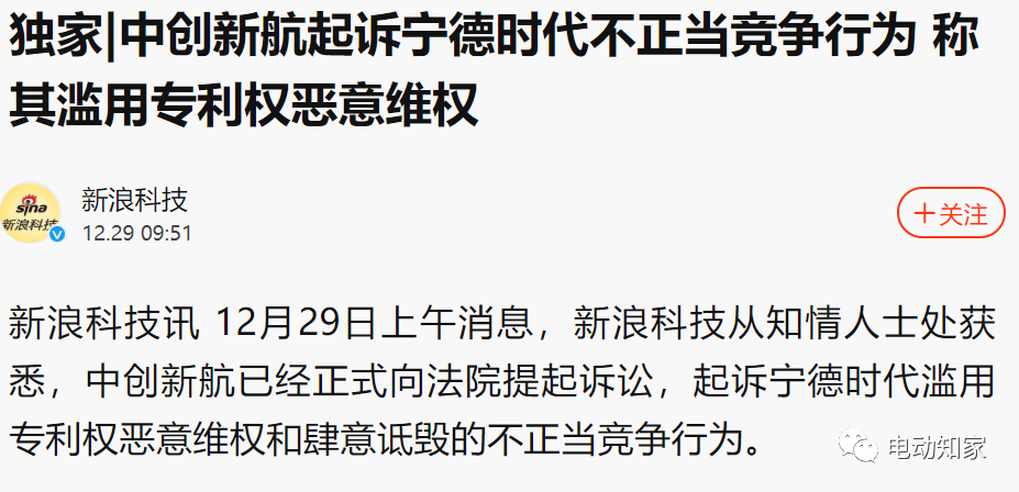 12月29日,據(jù)新浪科技報(bào)道,中創(chuàng)新航已經(jīng)正式向法院提起訴訟,起訴寧德時(shí)代濫用專利權(quán)惡意維權(quán)和肆意詆毀的不正當(dāng)競(jìng)爭(zhēng)行為。