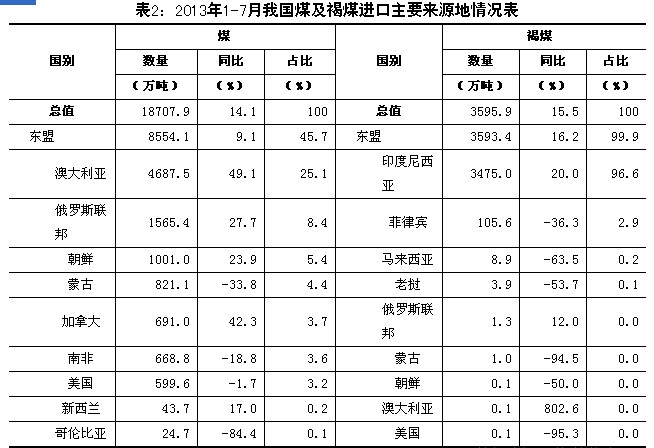 東盟、澳大利亞和俄羅斯居煤進(jìn)口市場(chǎng)前三位,褐煤幾乎全部進(jìn)口自東盟。1-7月我國(guó)自東盟進(jìn)口煤8554.1萬(wàn)噸,增加9.1%,占同期我國(guó)煤進(jìn)口總量的45.7%;其中自印度尼西亞進(jìn)口7517.6萬(wàn)噸,增加13.1%。同期,自澳大利亞進(jìn)口4687.5萬(wàn)噸,增加49.1%,占25.1%;自俄羅斯聯(lián)邦進(jìn)口1565.4萬(wàn)噸,增加27.7%,占8.4%;以上三者合計(jì)占同期我國(guó)進(jìn)口煤總量的79.2%。此外,褐煤進(jìn)口幾乎全部來(lái)自東盟,占比高達(dá)99.%,印度尼西亞是褐煤進(jìn)口最主要來(lái)源地,占比96.6%。(表2)