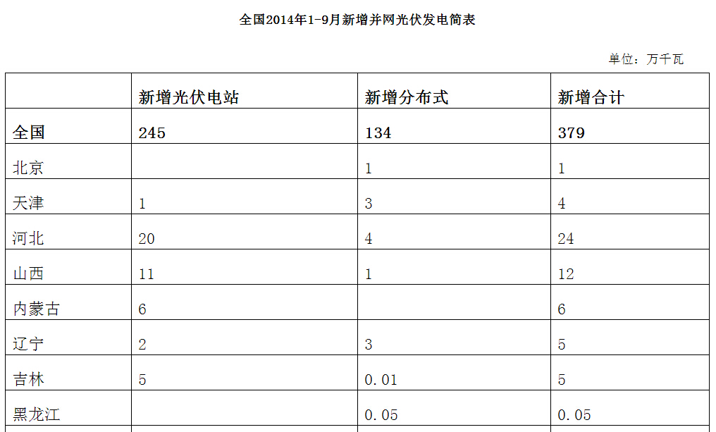 2014年前三季度,全國新增光伏發(fā)電并網容量379萬千瓦,其中,新增光伏電站并網容量245萬千瓦,新增分布式光伏并網容量134萬千瓦;全國光伏發(fā)電量約180億千瓦時,相當于2013年全年發(fā)電量的200%。