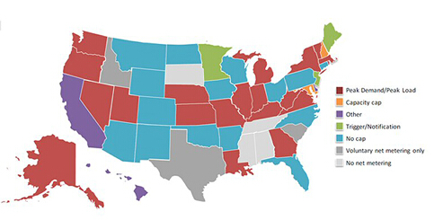 各州的凈計(jì)量電價(jià)制度上限值的定義。用紅色表示的州利用峰值需求計(jì)算上限值。