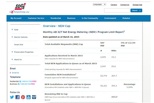 三家電力公司中,預(yù)計(jì)為南加利福尼亞和圣地亞哥地區(qū)提供服務(wù)的美國(guó)SDG&E公司將最早達(dá)到上限。在SDG&E的管轄內(nèi),在2015年3月31日已達(dá)到3.24%。