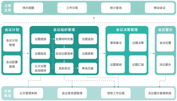 第四,加強(qiáng)綜合管控,深化體系統(tǒng)籌,實(shí)現(xiàn)會(huì)前、會(huì)中和會(huì)后的全業(yè)務(wù)鏈管理。特別是與決議督辦系統(tǒng)整合后,相關(guān)人員可以督辦、跟蹤會(huì)議決議的執(zhí)行情況,進(jìn)一步提高會(huì)議的價(jià)值。