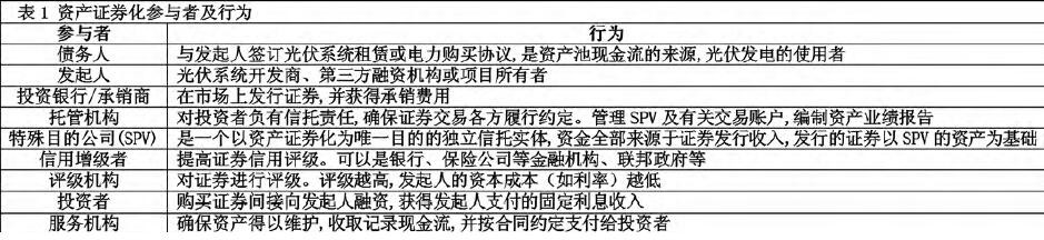 資產(chǎn)證券化是一種融資創(chuàng)新途徑。它是指將流動(dòng)性不強(qiáng)但能產(chǎn)生穩(wěn)定現(xiàn)金流的資產(chǎn)(如光伏租賃協(xié)議或電力購(gòu)買(mǎi)協(xié)議中規(guī)定的現(xiàn)金流)通過(guò)一定的結(jié)構(gòu)安排,轉(zhuǎn)換為標(biāo)準(zhǔn)化可交易的金融工具(如證券)。證券化的目的是提高光伏資產(chǎn)流動(dòng)性,融得大量資金滿足發(fā)展需要。基本流程是構(gòu)造證券化資產(chǎn),組建特殊目的公司(SPV)實(shí)現(xiàn)破產(chǎn)隔離、信用增級(jí)、信用評(píng)級(jí)、發(fā)行證券以及證券上市交易。