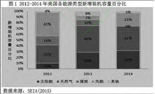 美國(guó)是世界上較早發(fā)展分布式光伏發(fā)電的國(guó)家之一。2006年美國(guó)有6000多座分布式發(fā)電站,200多個(gè)大學(xué)校園采用了分布式發(fā)電站供電。目前,分布式光伏在美國(guó)能源利用中扮演著越來(lái)越重要的角色。截至2014年末,美國(guó)光伏發(fā)電裝機(jī)總量達(dá)20GW,其中分布式光伏超過(guò)16.lOGW。新增光伏發(fā)電裝機(jī)僅次于天然氣(圖1),住宅光伏裝機(jī)首次超過(guò)非住宅光伏(SEIA,2015)。