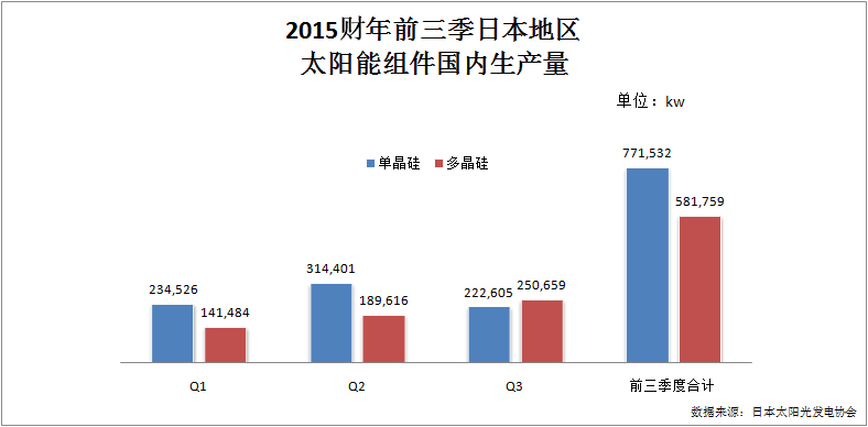 另外,從生產供應上來看,單晶組件也在日本國內也占絕對的主流地位。根據日本太陽光發電協會的統計數據(下圖),2015財年前三季(第四季未統計)日本國內單晶組件生產總量達到771532kw,占比57%,遠超多晶43%。可以看出,日本對單晶組件的重視是要大于多晶組件的。