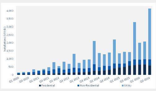 GTM Research副董事Cory Honeyman說:“受政府取消稅收抵免政策擔憂影響,2016年第三季度涌入大量公共事業規模項目儲備,這種趨勢將延續至2017上半年。”