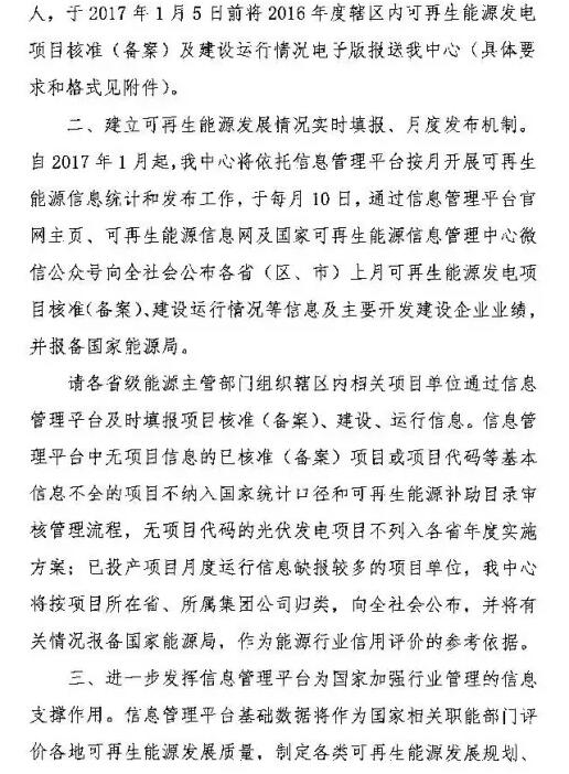 近日國家可再生能源信息管理中心發布《關于進一步做好可再生能源信息管理工作的函》。文件指出開展2016年度全國可再生能源發電發展情況統計工作。請各省級能源主管部門明確可再生能源信息統計工作聯系人,于2017年1月5日前將2016年度轄區內可再生能源發電項目核準(備案)及建設運行情況電子版報送日國家可再生能源信息管理中心。以下為文件原文: